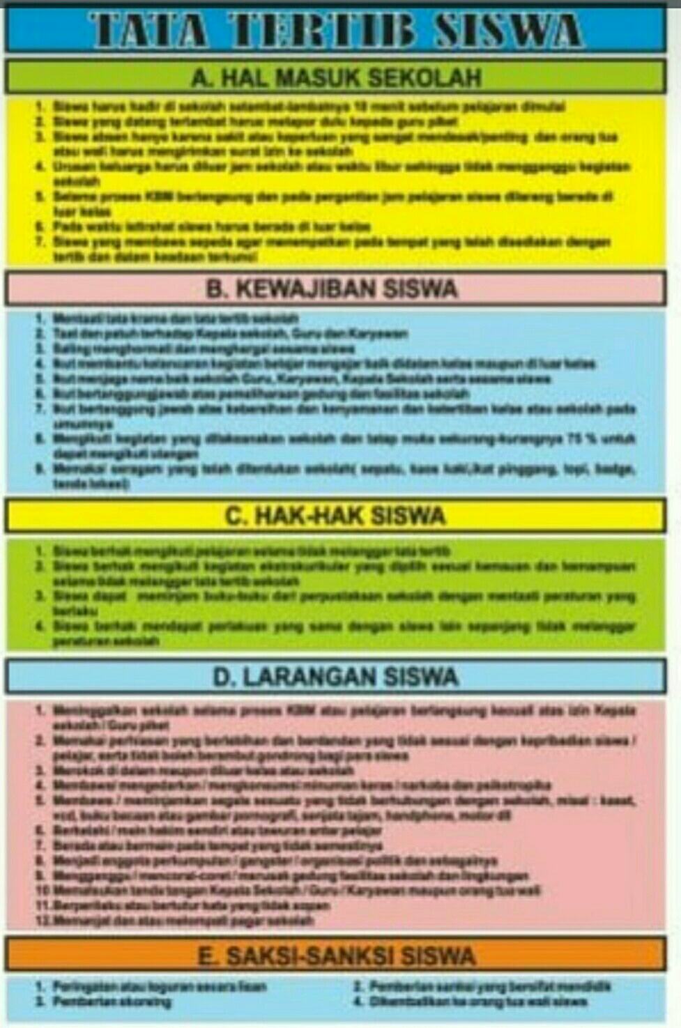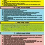 Perilaku di Kelas dan di Lingkungan Sekolah: Aturan mengenai sikap hormat terhadap guru dan staf, larangan membuat keributan, menjaga kebersihan, dan memelihara fasilitas sekolah.